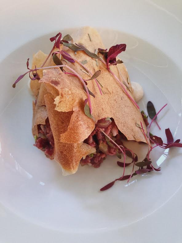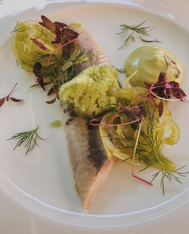 Zacznijmy od przystawek, których jestem największą fanką i przy pierwszej wizycie zamówiłam aż dwie. Filet z matiasa z majonezem koperkowym, marynowaną cebulą i sorbetem z ogórka oraz siekany tatar z polędwicy z jelenia z puree cebulowym i ziemniaczanym chipsem z trawą żubrową.