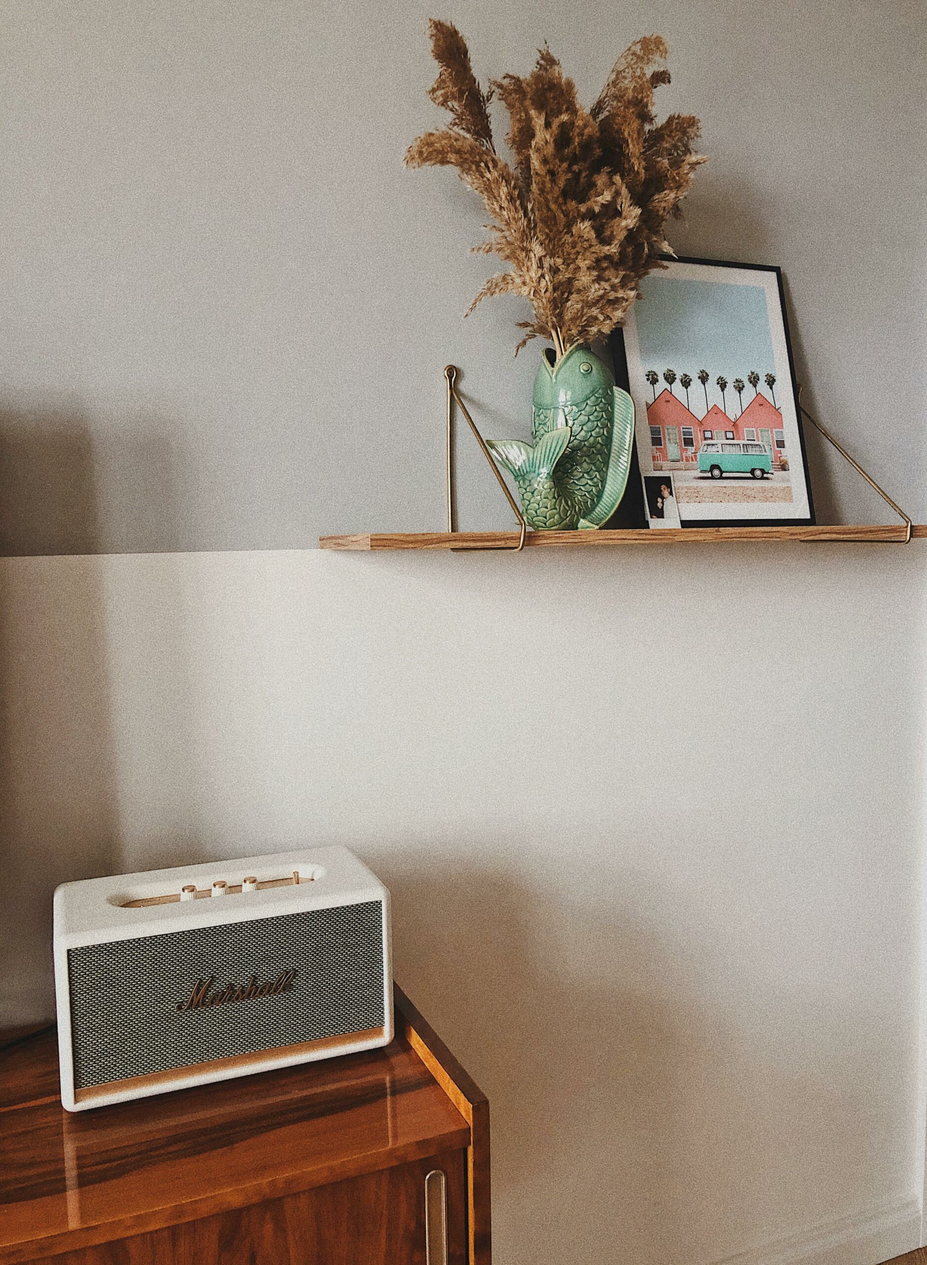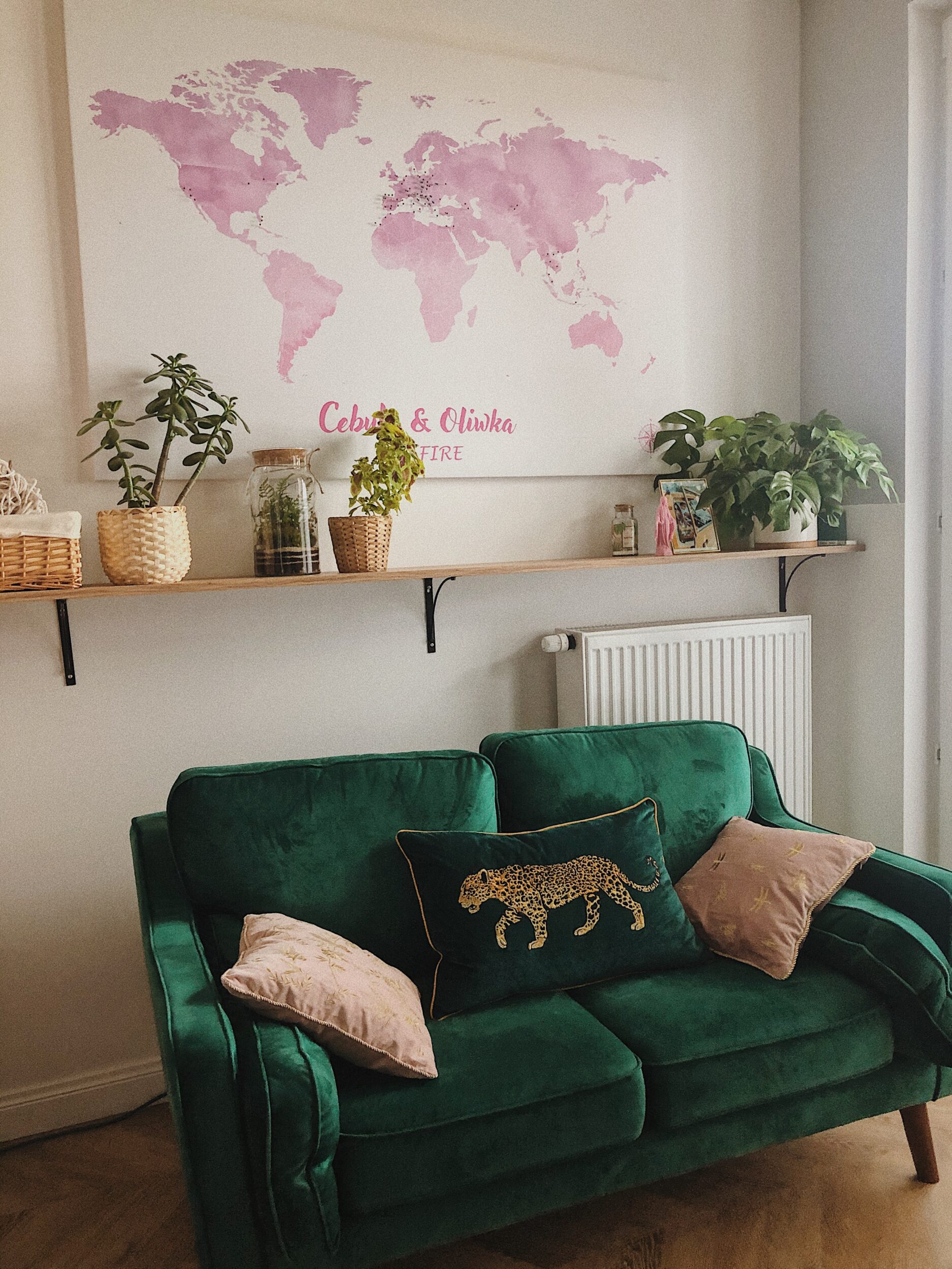 W salonie mamy jeden plakat z Desenio z wymarzonym vanem (jego nazwa to Ocean Side Plakat). A nad kanapą wisi wielka różowa mapą, którą dostałam od moich podróżniczych ziomków z bloga BeforeWeGetOld. Lubię ją, bo wygląda estetycznie i przypina się do niej pineski w poszczególne miejsca, a nie zdrapuje poszczególne kraje, bo nigdy tego nie rozumiałam: jak ktoś odwiedził tylko Moskwę lub Sankt Petersburg to może zmazać całą, ogromną Rosję? Trochę bez sensu.