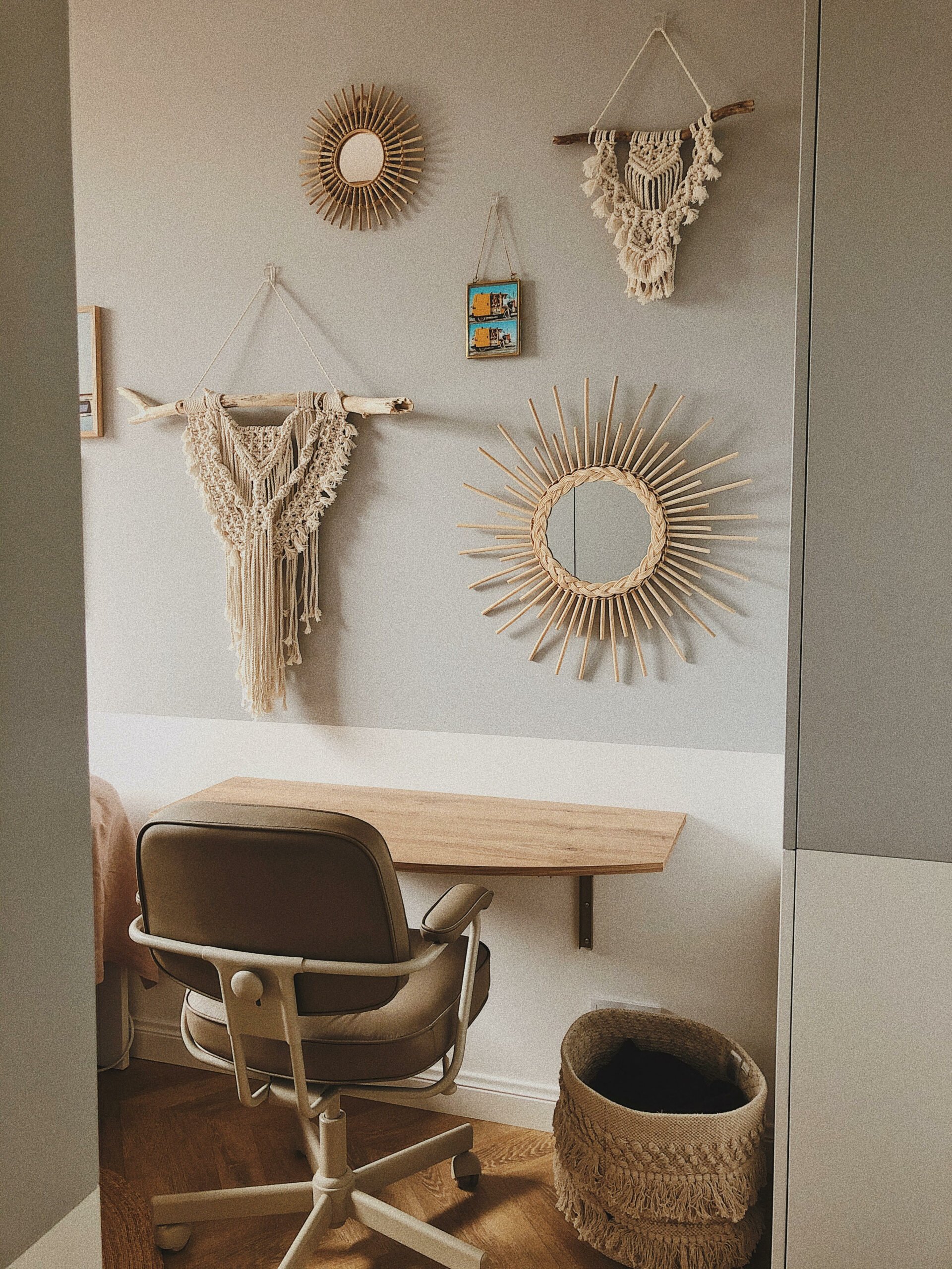 W sypialni zdecydowaliśmy się na świetne i mega stylowe plakaty z Desenio, makramy wykonane przez moją obserwatorkę @pynci oraz BOHO lustra nawiązujące do Bali z Allegro.